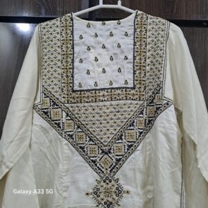 Upgrade your wardrobe with this beautifully designed 1-piece lawn embroidered shirt by Sapphire. Crafted from high-quality lawn fabric, this outfit features intricate black and golden embroidery on a soft off-white base, giving it a graceful and sophisticated look.