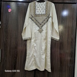 The detailed front panel showcases traditional patterns with fine threadwork, while the sleeves are finished with matching embroidered borders for a complete, polished style. Perfect for casual wear, festive gatherings, or semi-formal occasions.