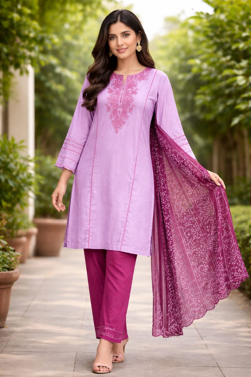 Elegant and refreshing, this Sapphire embroidered lawn 3-piece suit features a soft lavender shirt with intricate pink embroidery, paired with a rich magenta trouser and a beautifully patterned dupatta. Perfect for summer wear, casual outings, and festive gatherings.